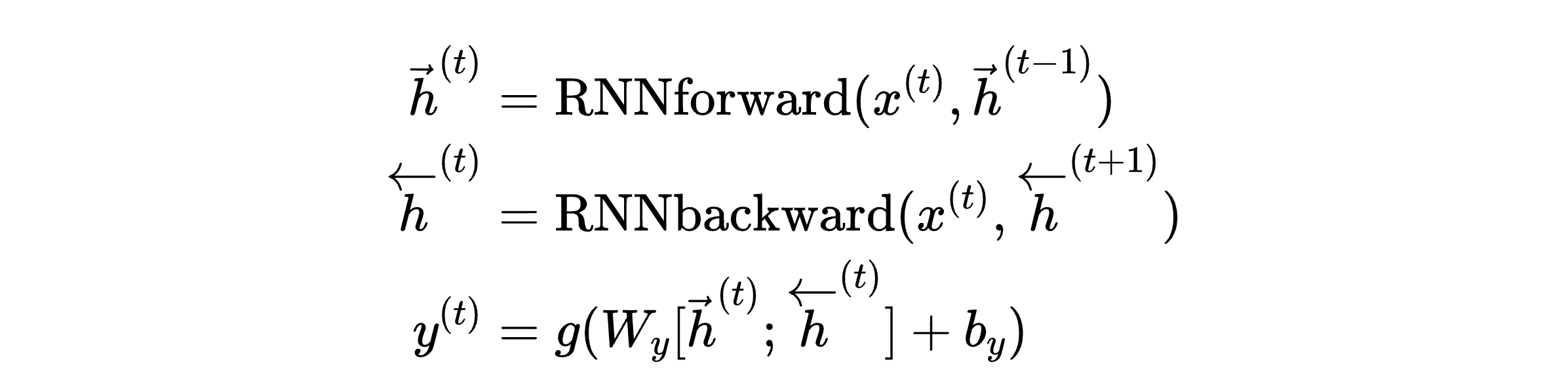 $$ \begin{align} h^{(t)} &= \tanh(W_{hh} h^{(t-1)} + W_{xh} x^{(t)} + b_h) \\ y^{(t)} &= \text{softmax}(W_{hy} h^{(t)} + b_y) \end{align} $$