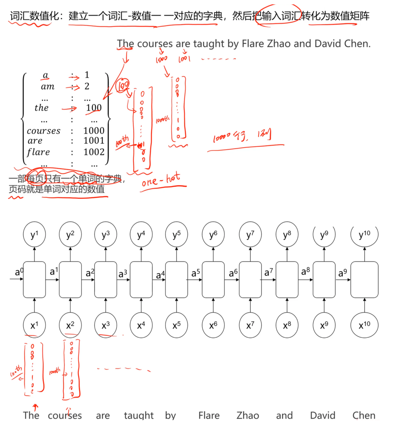对于词汇表大小 $V=10000$,如果 “learning” 的索引是 3: