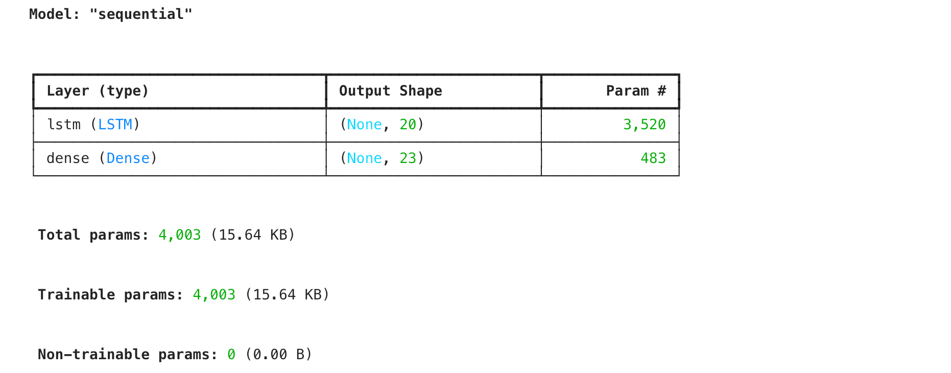 - 输出层:Dense 层,神经元数量等于字典大小(23),使用