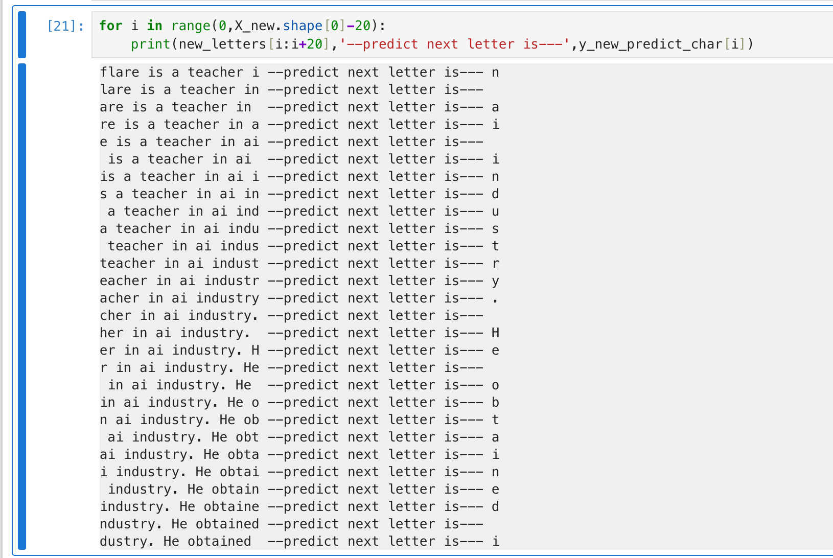 第二个项目更有趣:让 AI 学会写字。给定一段关于 “Flare” 老师介绍的文本,让模型学会预测下一个字符是什么。这是一个多分类任务。