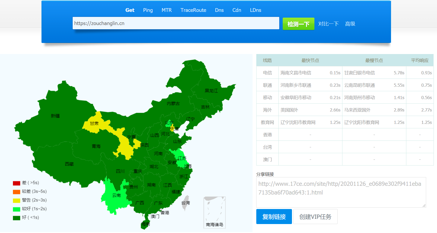 自从开启了全站CDN加速,全国访问都是很低的延迟: