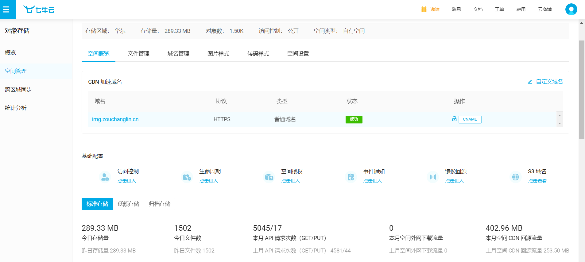 因为图片加载比较慢的问题,所以我又找了一个比较好的方案,那就是图床。最开始使用的微博图床,但是总感觉这个东西不是很靠谱,过了大概两周时间果然出现了图片被删除的情况,所以还好我有备份,打算另辟蹊径,最后又陆续尝试了路过图床、又拍云发现都是各有利弊。后来某天邮箱收到了七牛云给发的推广邮件,免费10GB对象存储空间。有个人备案域名的我简直是对七牛云爱了,我解析了一个子域名叫img.zouchanglin.cn,解析到七牛云的存储空间中,因为如果没有个人域名的话七牛云只会提供一个月时长的随机域名,过了一个月随机域名就会失效,意味着图片链接也无法使用了,下面是我的图片仓库: