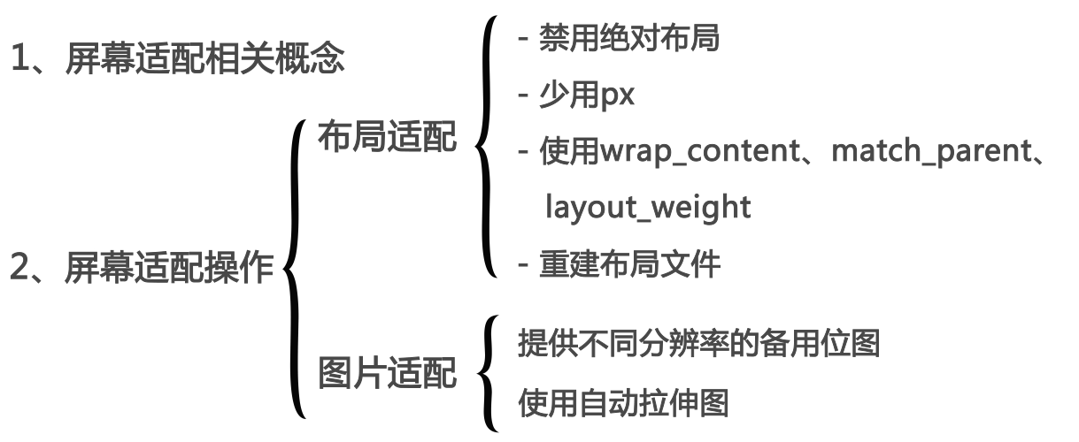 1、禁用绝对布局 2、少用px 3、使用wrap_content、match_parent、layout_weight 4、重建布局文件