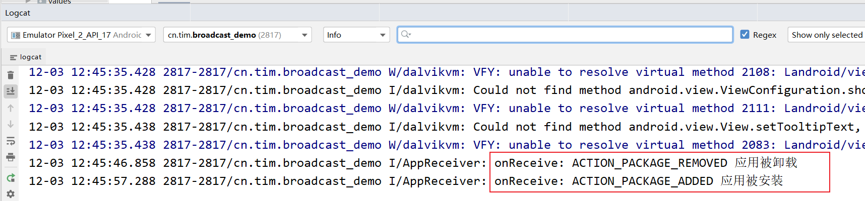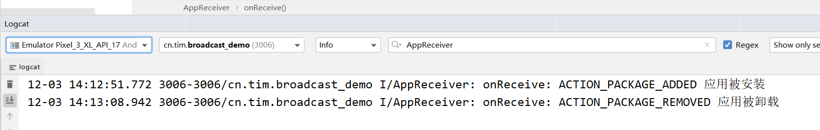 在进行应用卸载和安装的时候,就可以收到对应的广播了: