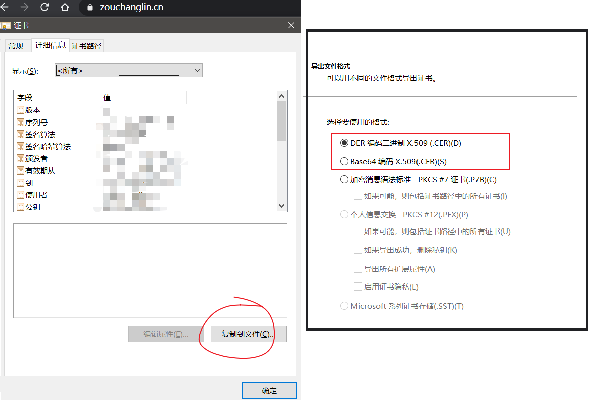 拿我自己的博客站点来说,想要获得证书只需要在浏览器下载对应的证书即可(选择DER编码二进制和Base64编码均可),保存了一个名为srca.cer的文件到桌面: