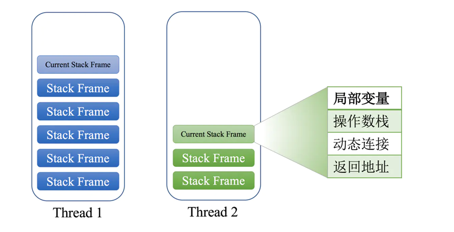 对于基于栈的虚拟机来说,每一个运行时的线程,都有一个独立的栈。栈中记录了方法调用的历史,每有一次方法调用,栈中便会多一个栈桢。最顶部的栈桢称作当前栈桢,其代表着当前执行的方法。基于栈的虚拟机通过操作数栈进行所有操作。