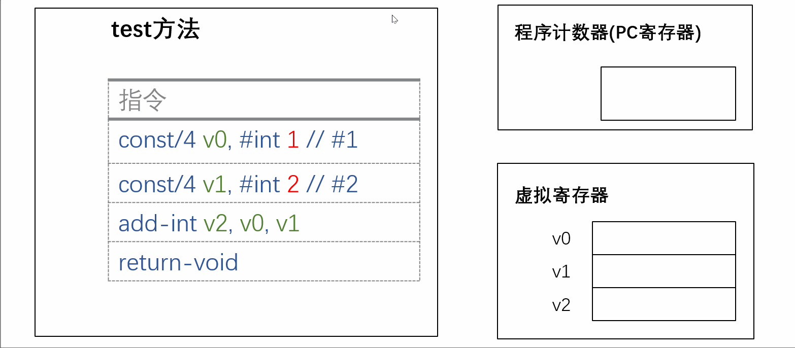 Dalvik是基于寄存器的虚拟机,其指令集需要指定源地址和目标地址(理解为变量声明),因此需要更多的指令空间。Dalvik的某些指令需要占用两个字节。