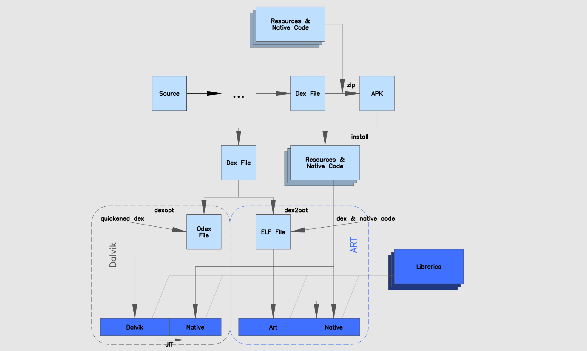 而ART(Android Runtime) 是在 Android 4.4 中引入的一个开发者选项,也是 Android 5.0 及更高版本的默认 Android 运行时。ART虚拟机执行的是本地机器码。Android的运行时从Dalvik虚拟机替换成ART虚拟机,并不要求开发者将自己的应用直接编译成目标机器码,APK仍然是一个包含dex字节码的文件。