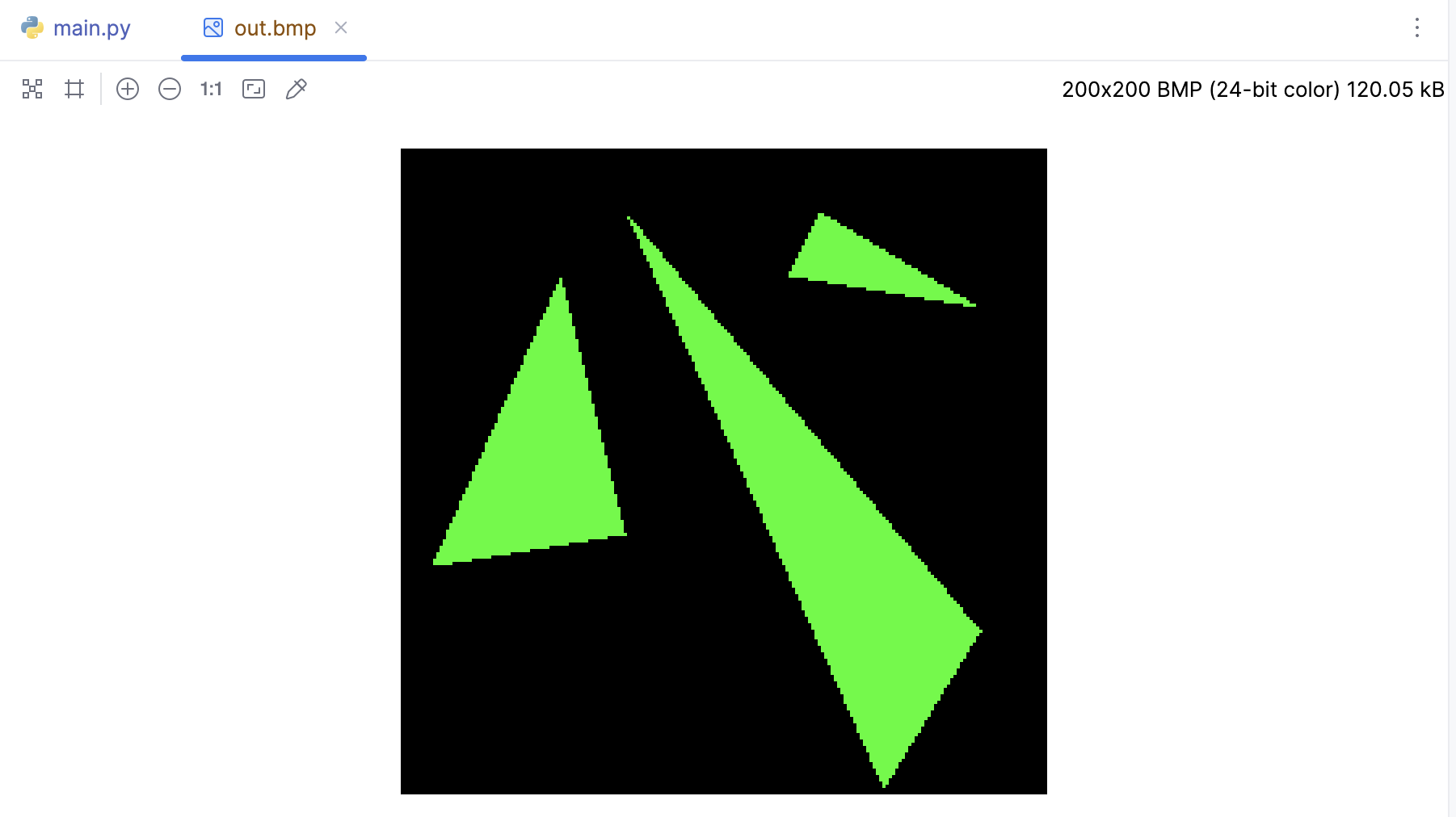 包围盒算法是一种简单有效的用于绘制三角形的方法,下面我们用包围盒的方式来完成三角形的绘制,我们首先计算出三角形的包围盒,也就是包含三角形的最小矩形。然后,我们遍历包围盒中的每个像素,对于每个像素,我们计算它到三角形三个顶点的向量,然后计算这些向量的叉积。如果所有的叉积都是正的,那么这个像素就在三角形内,我们就将其颜色设为绿色。