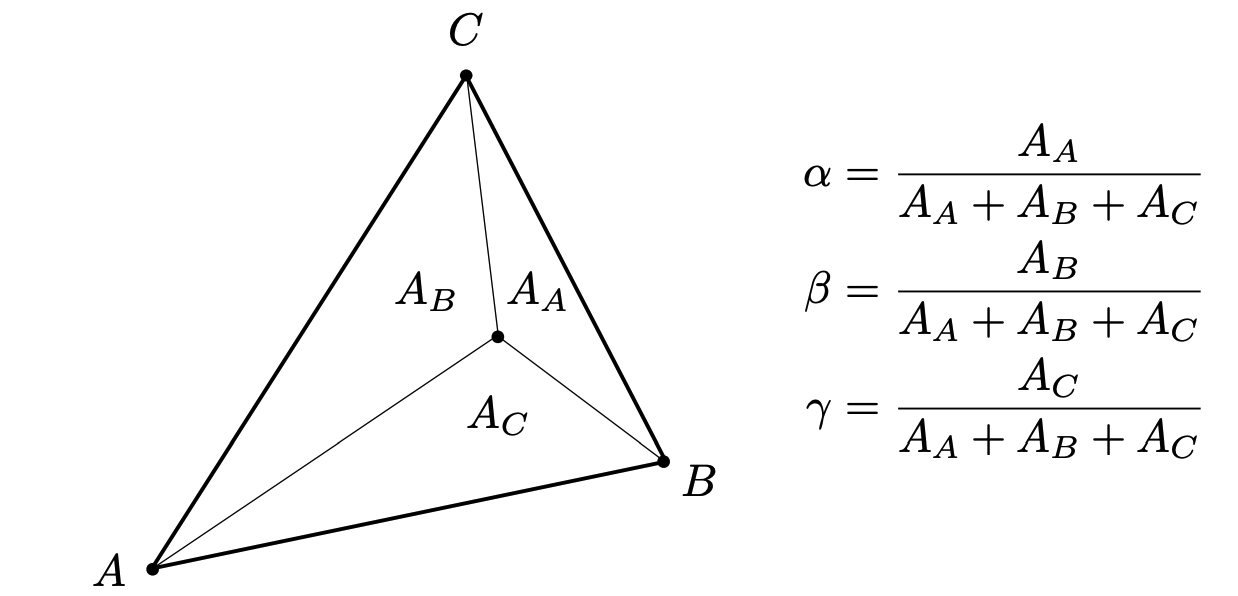 。其实我们完全有更简单的方式来解决这个问题,那就是重心坐标。给定一个包含点 A、B、C 和点 P 的三角形,我们想要找到一个向量 u、v、w,使得: