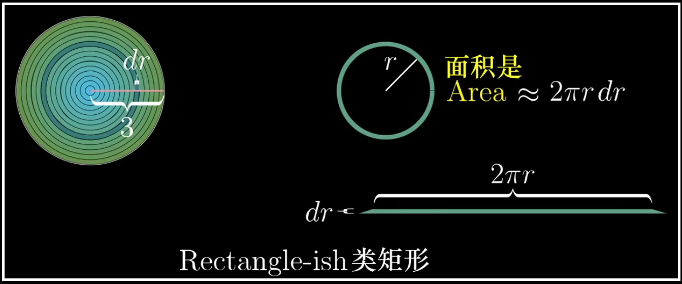 如下图所示:每个圆环展开后近似看作为矩形,只要圆环切割的足够细,计算结果就越准确,为了体现微积分标准符号的思想,圆环的厚度先定义为 $dr$,那么圆环的面积就近似于 $2 \pi R dr$ ,$dr$ 越小近似就越准