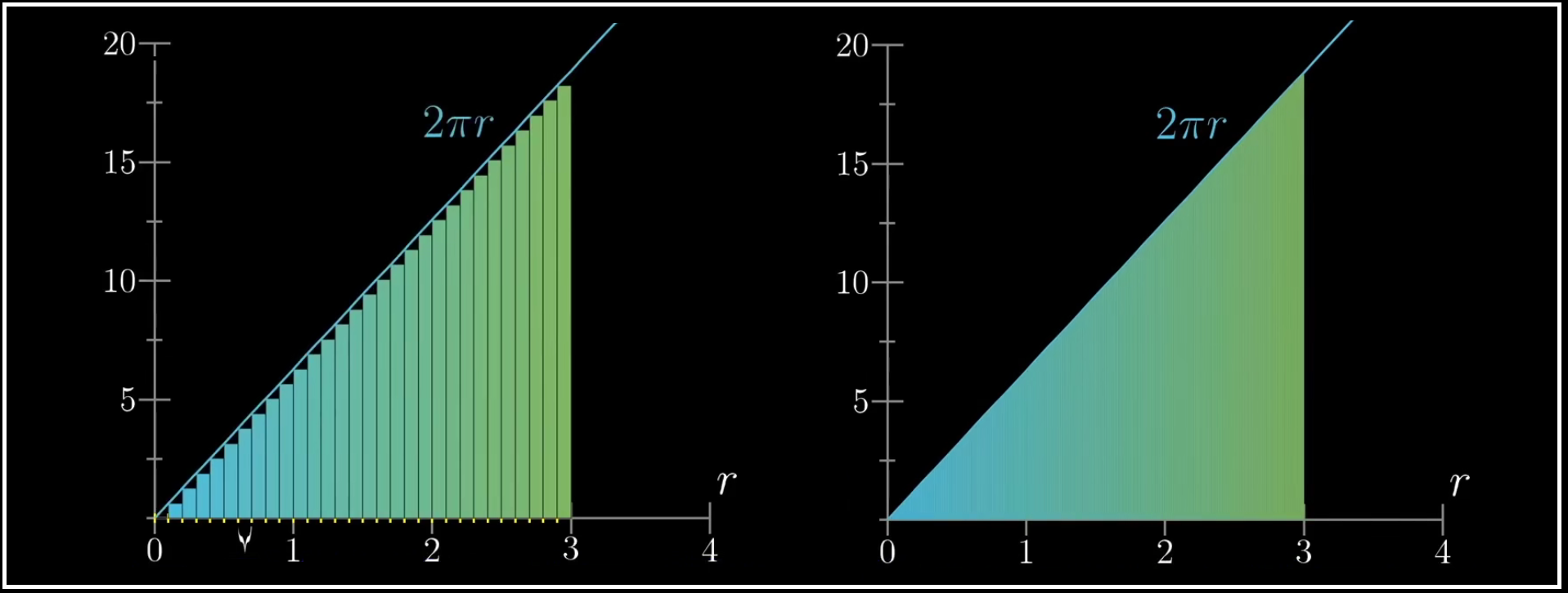 然后把这些类矩形从低到高排列起来,这些矩形的高其实就是每一个圆环的周长,都分布在 $y= 2 \pi r$ 的函数上面,最高(或者说最大周长为)$2 \pi R $,只要 $dr$ 足够小,这些矩形加起来的面积正好就是下面这个三角形的面积,所有 $dr$ 加起来也就是圆形的半径r,所以这个三角形的面积就是圆的面积: