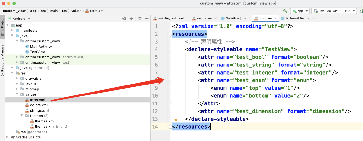 自定义View我们需要分析需要的自定义属性,然后在res/ valus/atrs.xm定义声明,在layout.xml文件中进行使用,在View的构造方法中进行获取,先在values文件夹下新建一个attrs.xml文件,里面就可以编写我们的自定义属性了,需要注意的是自定义属性的类型,比如boolean、string、enum、integer……