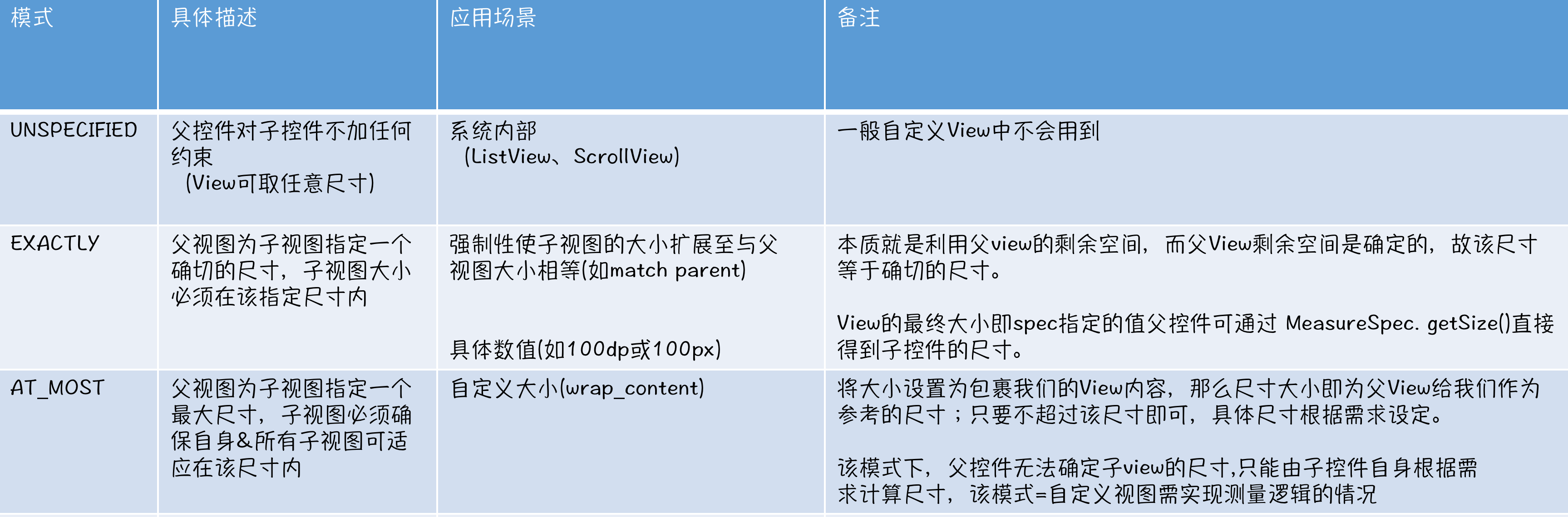 当子View采用wrap_content时 | 测量模式 = AT MOST<br/>测量大小 = 不超过父容器的剩余空间 |