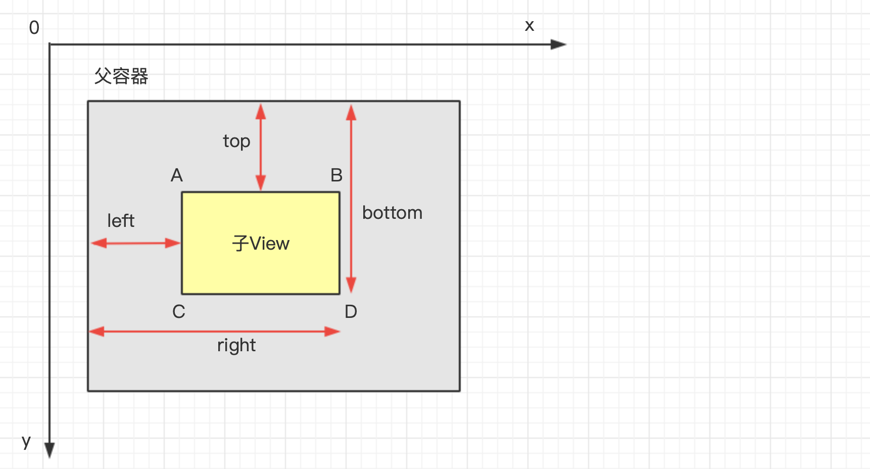 Top:子View上边界到父view上边界的距离,Left:子View左边界到父view左边界的距离,Bottom:子View下边距到父View上边界的距离,Right:子View右边界到父view左边界的距离。