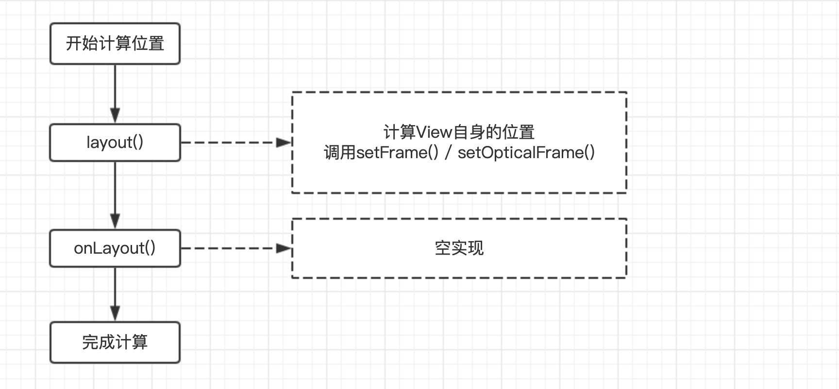 Layout过程也可以根据View的类型分为2种情况:对于单一View,仅仅需要计算本身View的位置即可。对于ViewGroup,除了计算自身View的位置外,还需要确定子View在父容器中的位置,即遍历调用所有子元素的measure()并且各子元素再递归去执行该流程。View树的位置是由包含的每个子视图的位置所决定的,所以如果想要计算整个View树的位置,则需递归计算每个子视图的位置,这与measure过程非常相似。