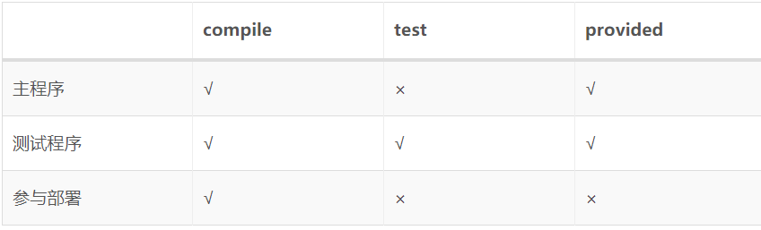 大家注意到上面的依赖信息中除了目标jar包的坐标还有一个scope设置,这是依赖的范围。依赖的范围有几个可选值,我们用得到的是:compile、test、provided三个。