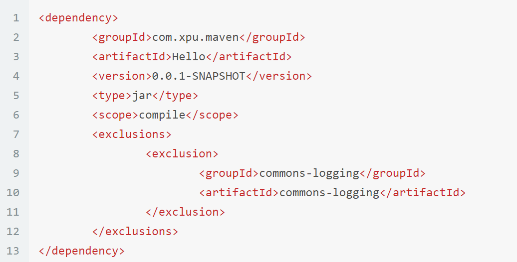 如果我们在当前工程中引入了一个依赖是A,而A又依赖了B,那么Maven会自动将A依赖的B引入当前工程,但是个别情况下B有可能是一个不稳定版,或对当前工程有不良影响。这时我们可以在引入A的时候将B排除: