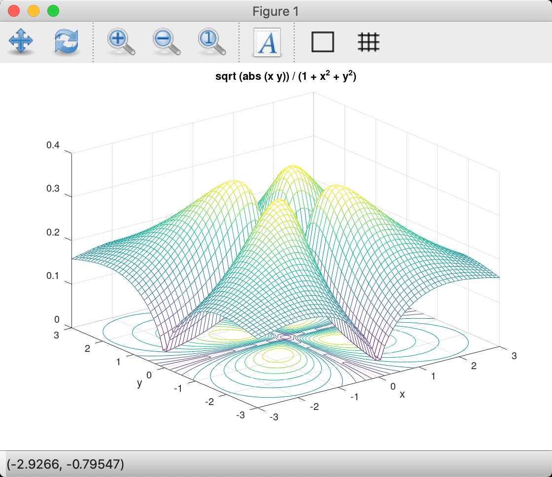 octave:1> f = @(x,y) sqrt (abs (x .* y)) ./ (1 + x.^2 + y.^2);