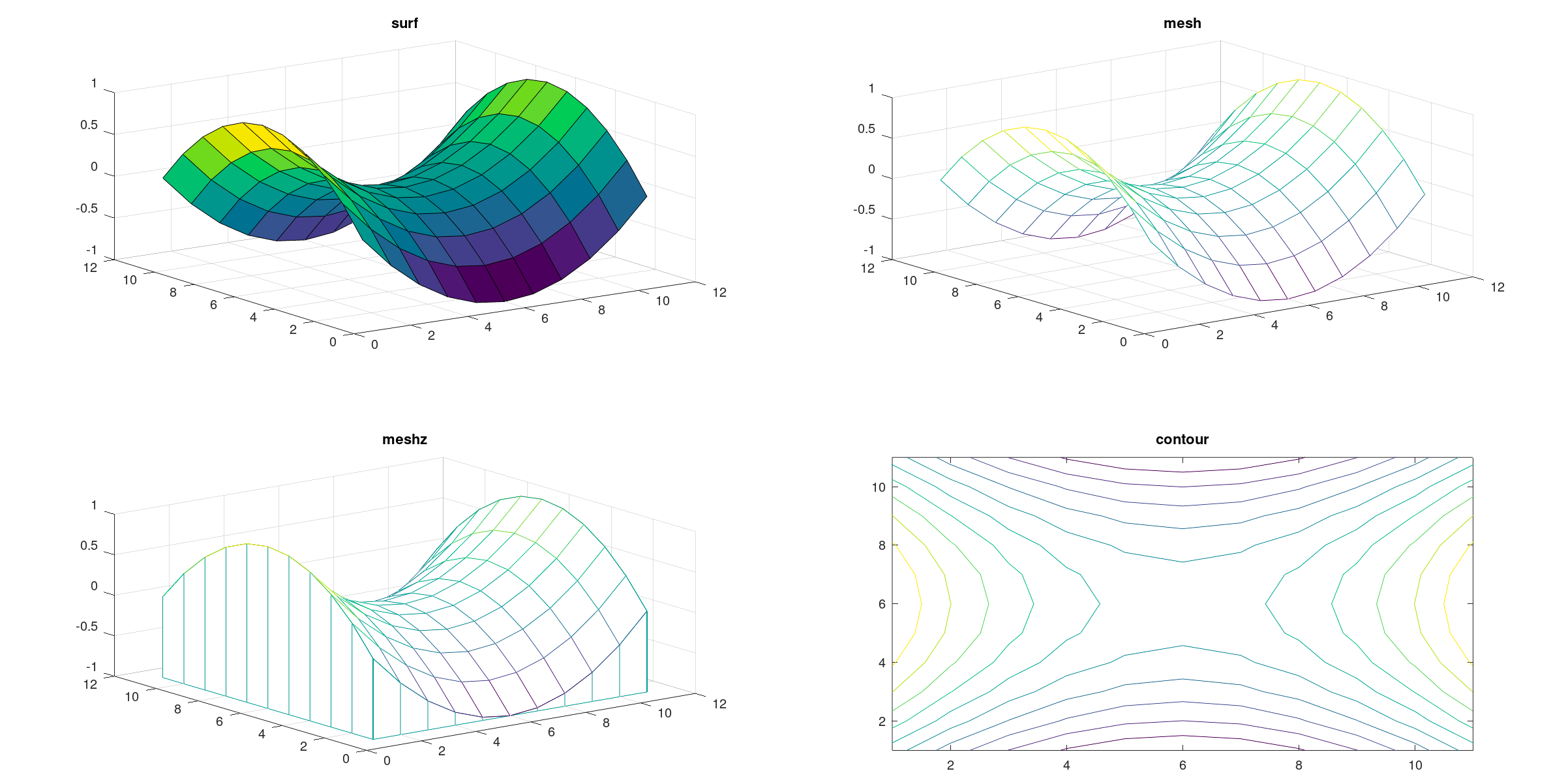 Octave 的画图功能不仅仅是画简单的二维直角坐标系下的曲线。通过调用 GNUPLOT,它可以画出条形图,3D 表面,等高线图和极坐标图等等。有关这些内容的细节可以参考 Octave 的帮助系统或者官方文档。