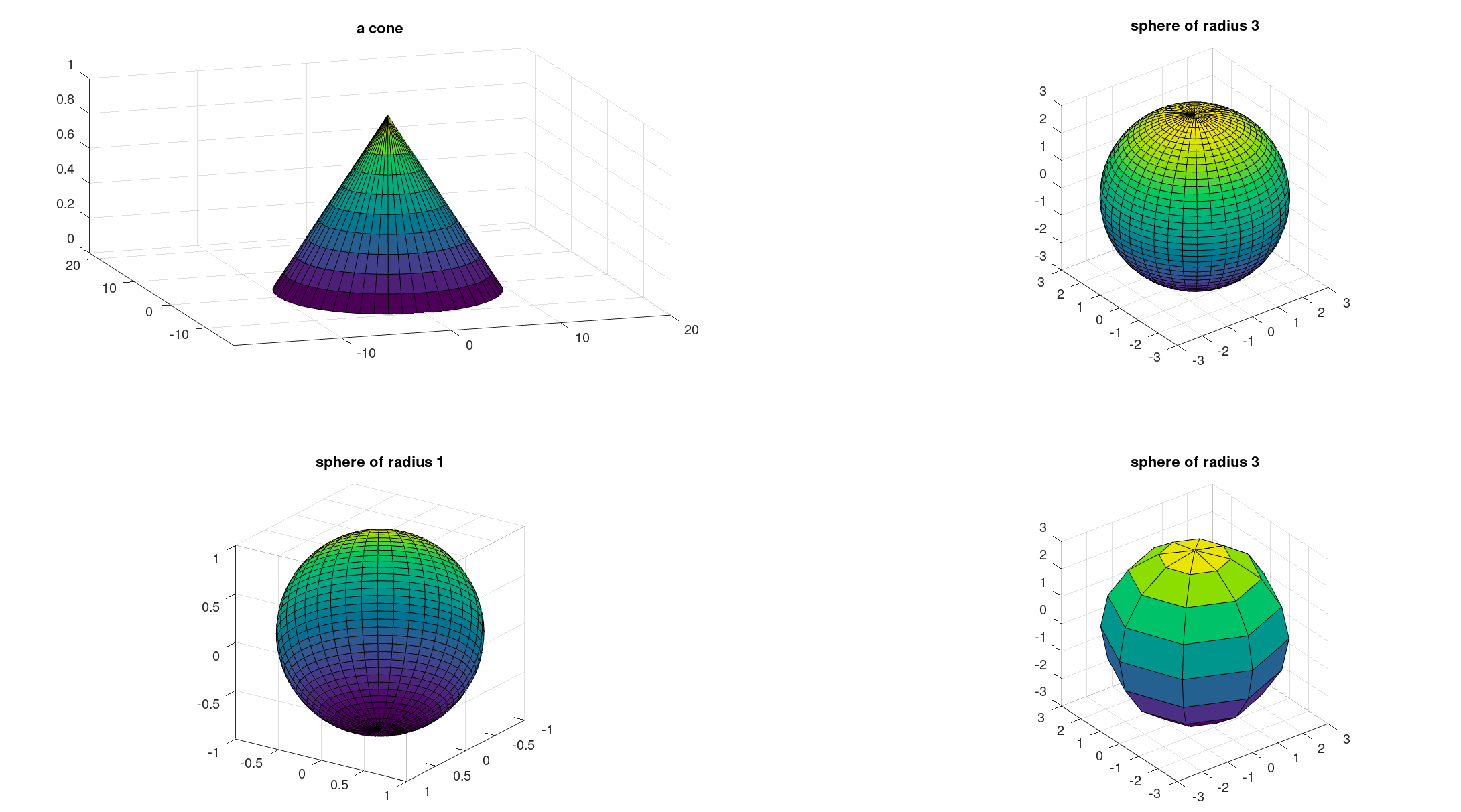 Octave提供了非常多的函数来绘制三维几何形状,球体、圆柱体等都有对应的函数,查阅相关文档即可搞清楚函数的使用方式,比如绘制球体和圆锥: