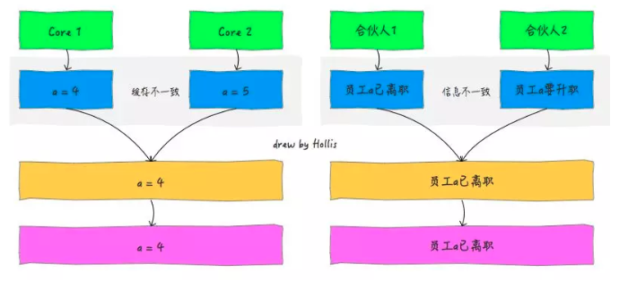 多核CPU,多线程。 每个核都至少有一个L1 缓存。多个线程访问进程中的某个共享内存,且这多个线程分别在不同的核心上执行,则每个核心都会在各自的caehe中保留一份共享内存的缓冲。由于多核是可以并行的,可能会出现多个线程同时写各自的缓存的情况,而各自的cache之间的数据就有可能不同。