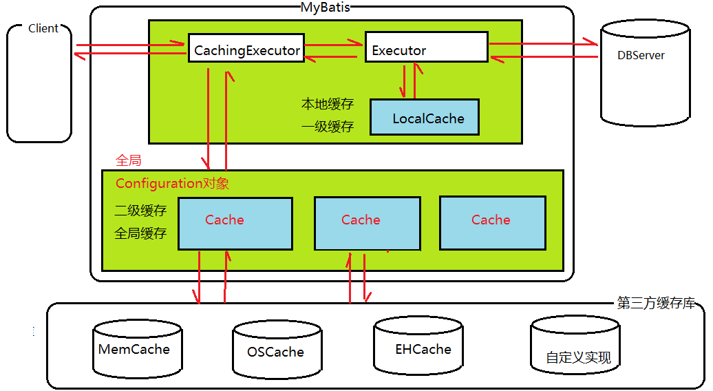 Mybatis中有一级缓存和二级缓存,默认情况下一级缓存是开启的,而且是不能关闭的。一级缓存是指SqlSession级别的缓存,当在同一个SqlSession中进行相同的SQL语句查询时,第二次以后的查询不会从数据库查询,而是直接从缓存中获取,一级缓存最多缓存1024条SQL。二级缓存是指可以跨SqlSession的缓存,Mybatis中进行SQL查询是通过org.apache.ibatis.executor.Executor接口进行的,总体来讲,它一共有两类实现,一类是BaseExecutor,一类是CachingExecutor。前者是非启用二级缓存时使用的,而后者是采用的装饰器模式,在启用了二级缓存时使用,当二级缓存没有命中时,底层还是通过BaseExecutor来实现的: