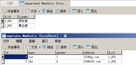 下面的示例基于《MyBatis(一)》,但是在数据库层面稍有修改,新增department表代表部门和部门id,employee表新增d_id,意思是员工的部门编号: