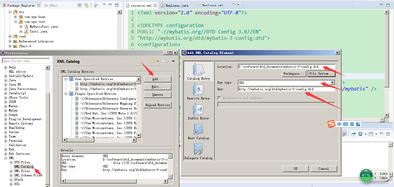 dataSource 标签配置的数据库连接的基本信息,mappers标签配置的是对象映射关系文件,说一下关于引入dtd约束文档的问题,如果未配置dtd约束文档,那么eclipse是没有提示的,你可以在Window--->Preference-->XML--->XMLCatalog里面配置dtd,点击Add,选择URL,填入dtd的URL,选择FileSystem点击打开下载好的dtd文件即可!