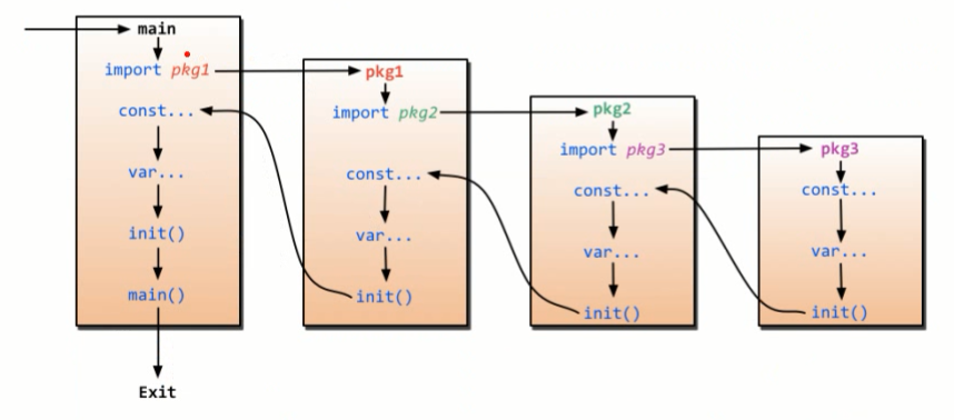 程序的初始化和执行都起始于main包。如果main包还导入了其它的包,那么就会在编译时将它们依次导入。 有时一个包会被多个包同时导入,那么它只会被导入一次( 例如很多包可能都会用到fmt包,但它只会被导入一次,因为没有必要导入多次)。