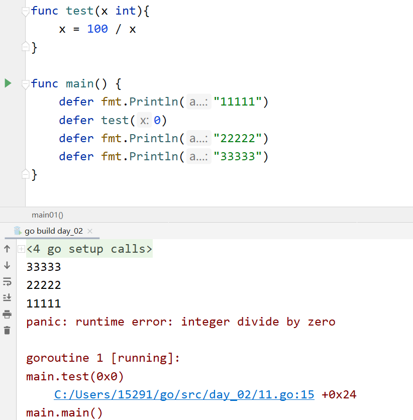 如果一个函数中有多个defer语句,它们会以LIFO (后进先出)的顺序执行。哪怕函数或某个延迟调用发生错误,这些调用依旧会被执行。