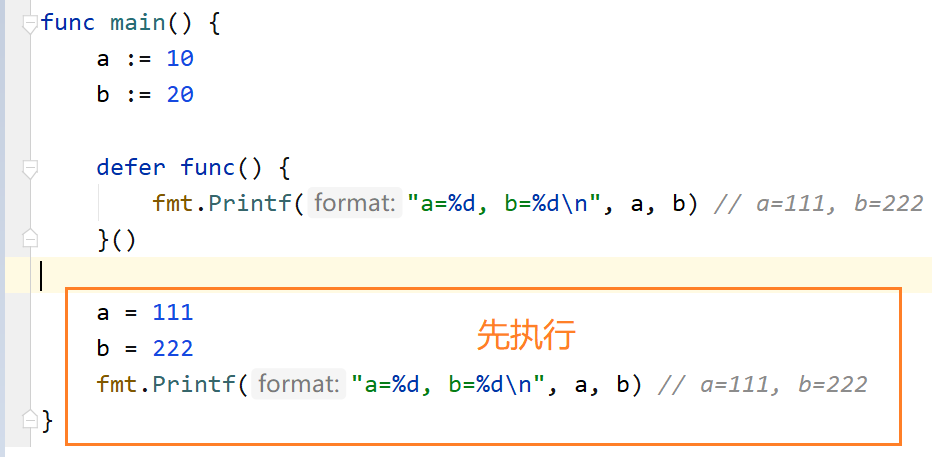 fmt.Printf("a=%d, b=%d\n", a, b)