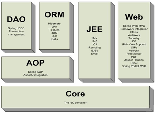 Spring WEB:Spring提供了对Struts、Springmvc的支持,支持WEB开发。与此同时Spring自身也提供了基于MVC的解决方案 。
