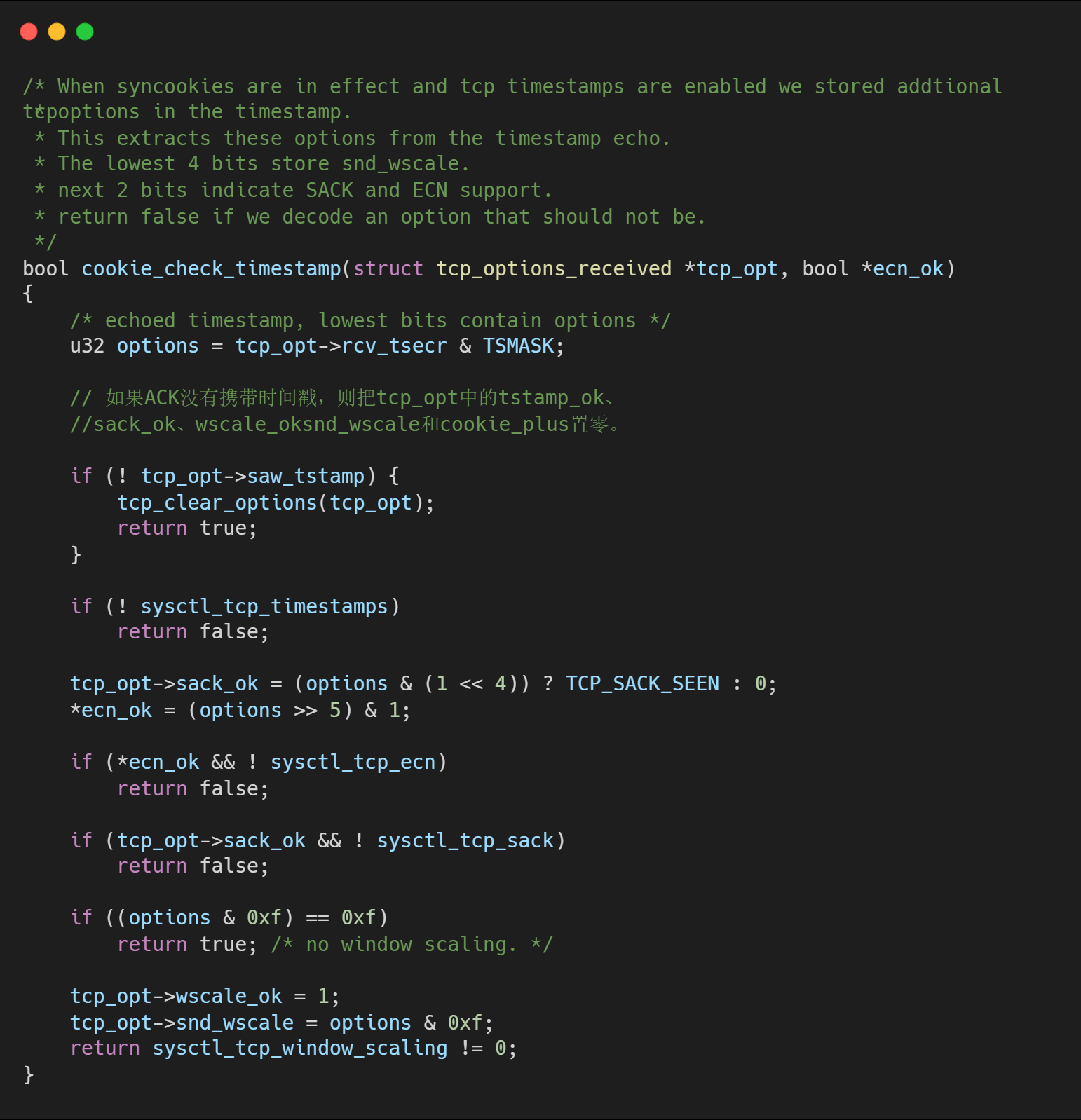 服务器会构造一个 sequence number,根据 TCP 规范,由端点发送的第一个序号可以是由该端点决定的任何值。SYN Cookies 是根据以下规则构造的初始序号: