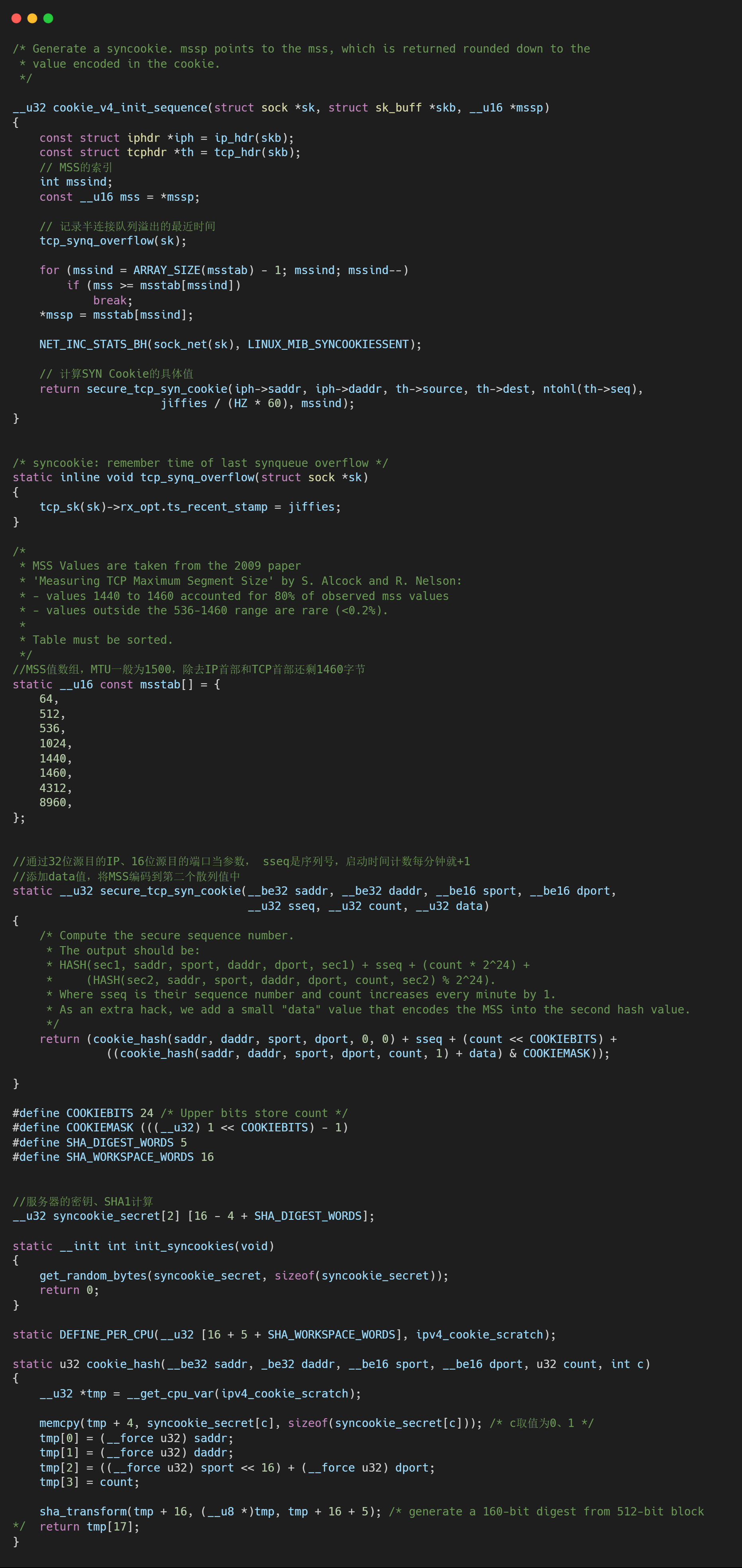 MAC是密码学中的一个消息认证码函数,也就是满足某种安全性质的带密钥的hash函数,它能够提供cookie计算中需要的安全性。在Linux实现中,MAC函数为SHA1
