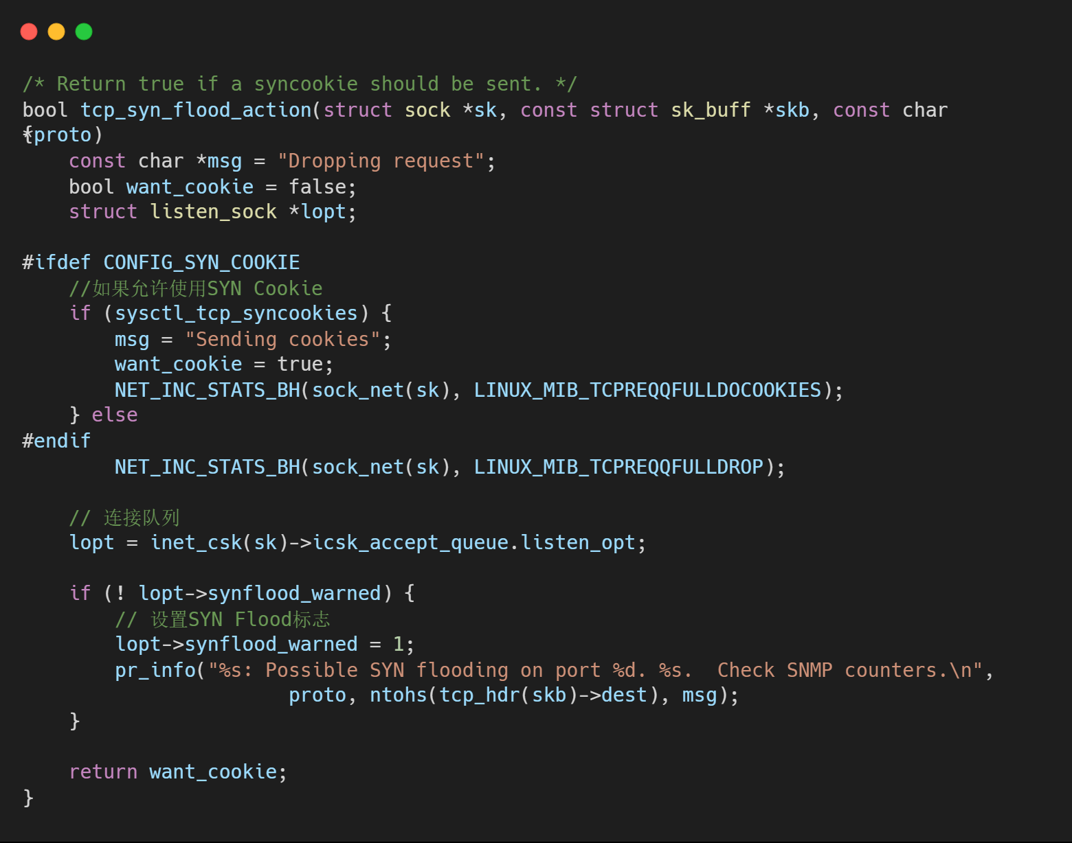 如果SYN Cookie功能有编译进内核(CONFIG_SYN_COOKIE),且选项tcp_syncookies不为0,那么可使用SYN Cookie。同时设置SYN Flood标志(listen_opt->synflood_warned)