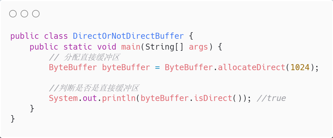 字节缓冲区是直接缓冲区还是非直接缓冲区可通过调用其isDirect()方法来确定。提供此方法是为了能够在 性能关键型代码中执行显式缓冲区管理。