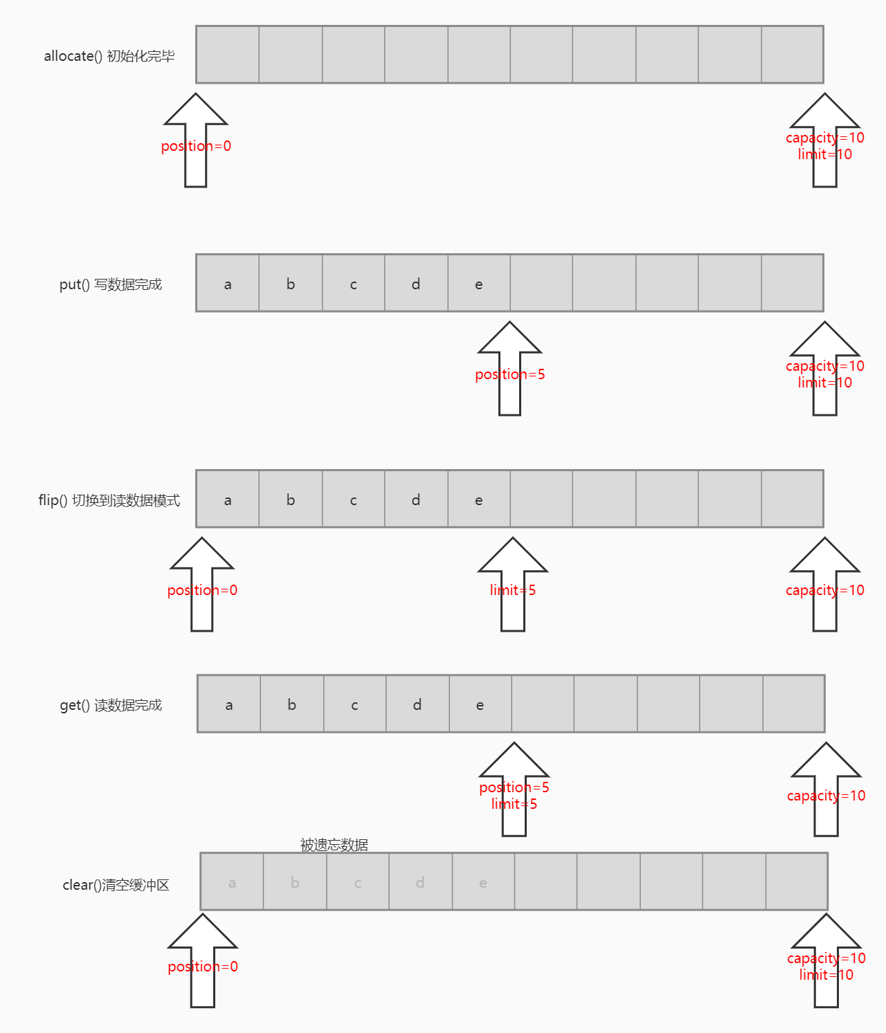 - limit:界限,表示缓冲区中可以操作数据的大小(limit后面的数据是不能进行读写的)