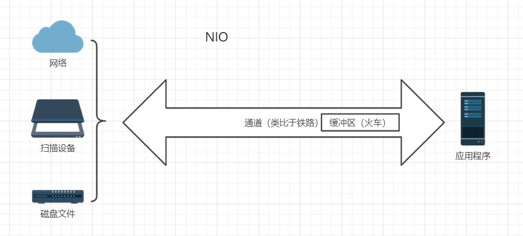现在看看NIO,NIO相当于建立的不是输入输出流,而是通道,通道只是负责连接,可以把通道看成是铁路,把缓冲区看成是火车,数据看作火车上的乘客,火车既能从应用程序到网络、扫描设备、文件,也能从网络、扫描设备、文件等到应用程序,是双向的IO,所以NIO是面向缓冲区的!