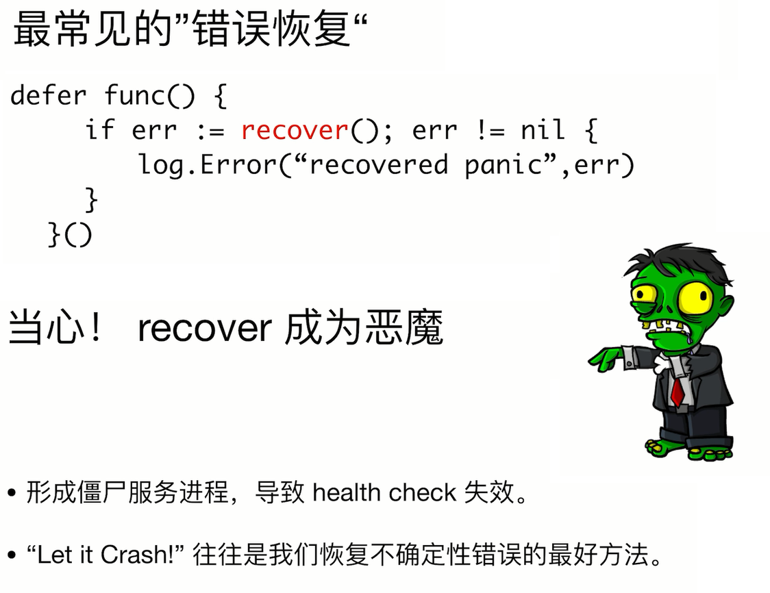 很多人容易在defer处理错误时把recover获得的错误对象打印到日志文件中,这是一种非常危险的做法,一定要当心recover在做的事情,因为recover的时候并不去检测到底发生了什么错误,而是直接忽略了这个错误,那么如果这个时候系统的核心资源消耗完了,如果我们强制性的恢复的话系统仍然是不能正常工作的,还会导致我们的健康检查程序没办法检查出当前系统的问题,因为很多的health check只是检查进程在还是不在,因为我们的进程是在的,所以会导致僵尸服务进程,虽然活着但是无法正常提供服务。于是我们可以采用恢复设计模式中的一种叫做Let it Crash ,health check进程就会帮我们重启这个服务