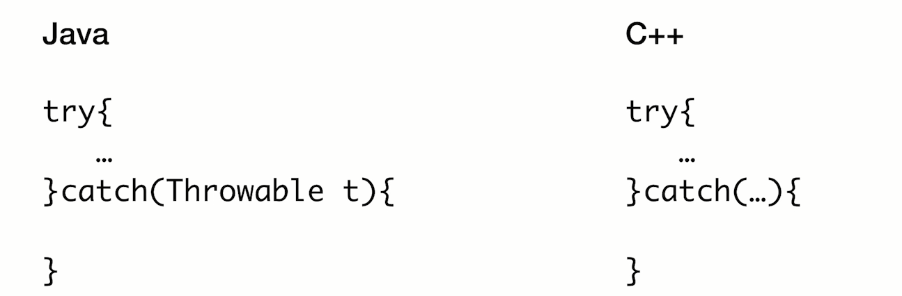在Java中如果你不知道要抛出什么错误,于是乎很多人直接来个Catch Throwable,作为一个异常无Fack说,C++中是直接catch...作为一个异常无Fack说