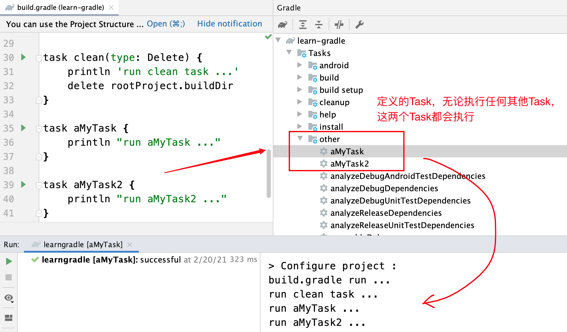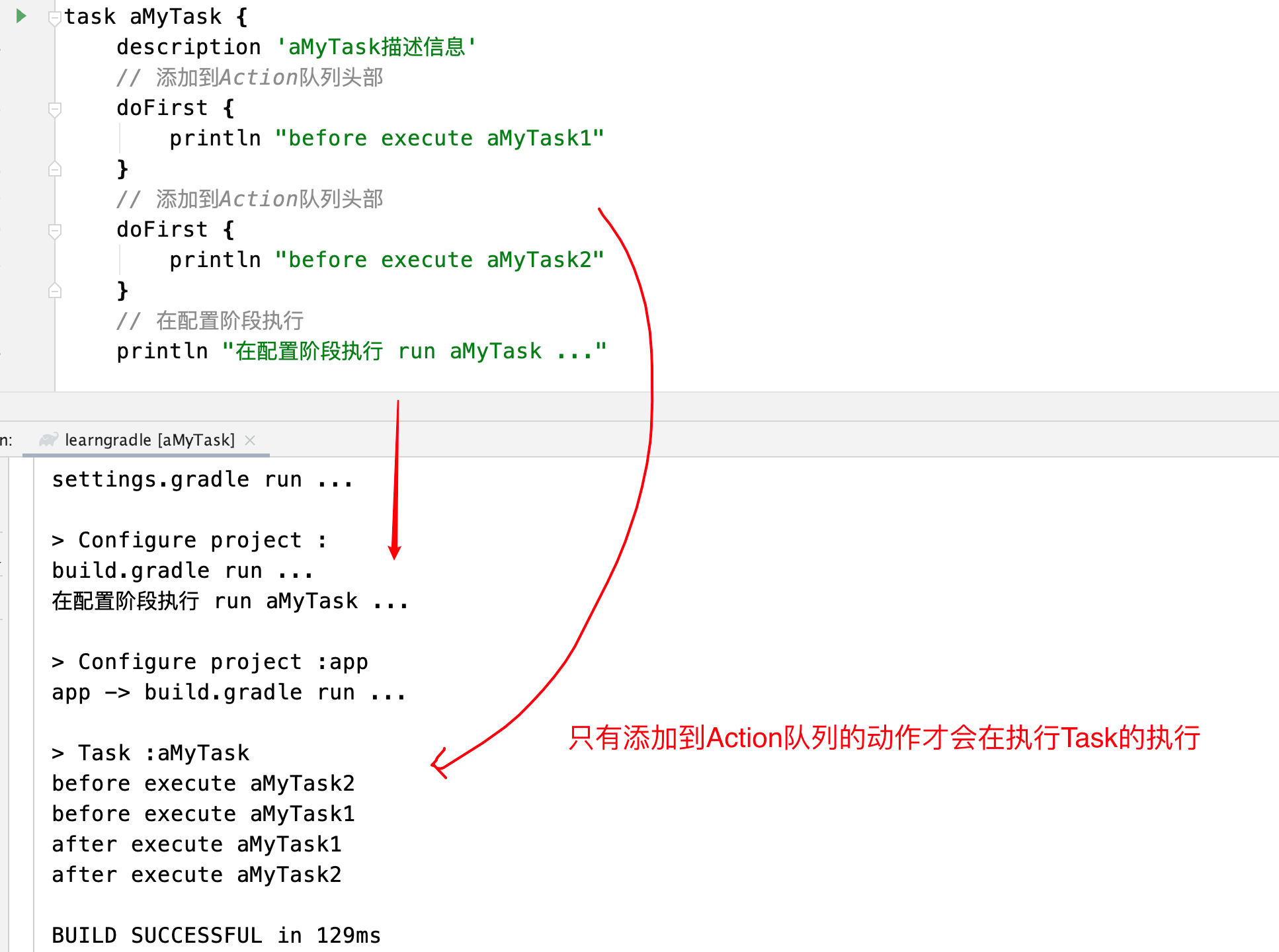 通过上述方式定义的task,括号内部的代码会在配置阶段执行,也就是说,只要我执行任何一个task,那段代码都会执行,因为每个task执行之前都需要进行一遍完整的配置。但是很多时候我们并不需要写配置代码,我们想要括号内的代码仅仅在执行我们的task的时候才执行,这个时候可以通过doFirst或者doLast来完成。需要注意的是,一个project包含多个Task,一个Task包含多个Action,这里的Action就是完成一个Task需要的具体操作: