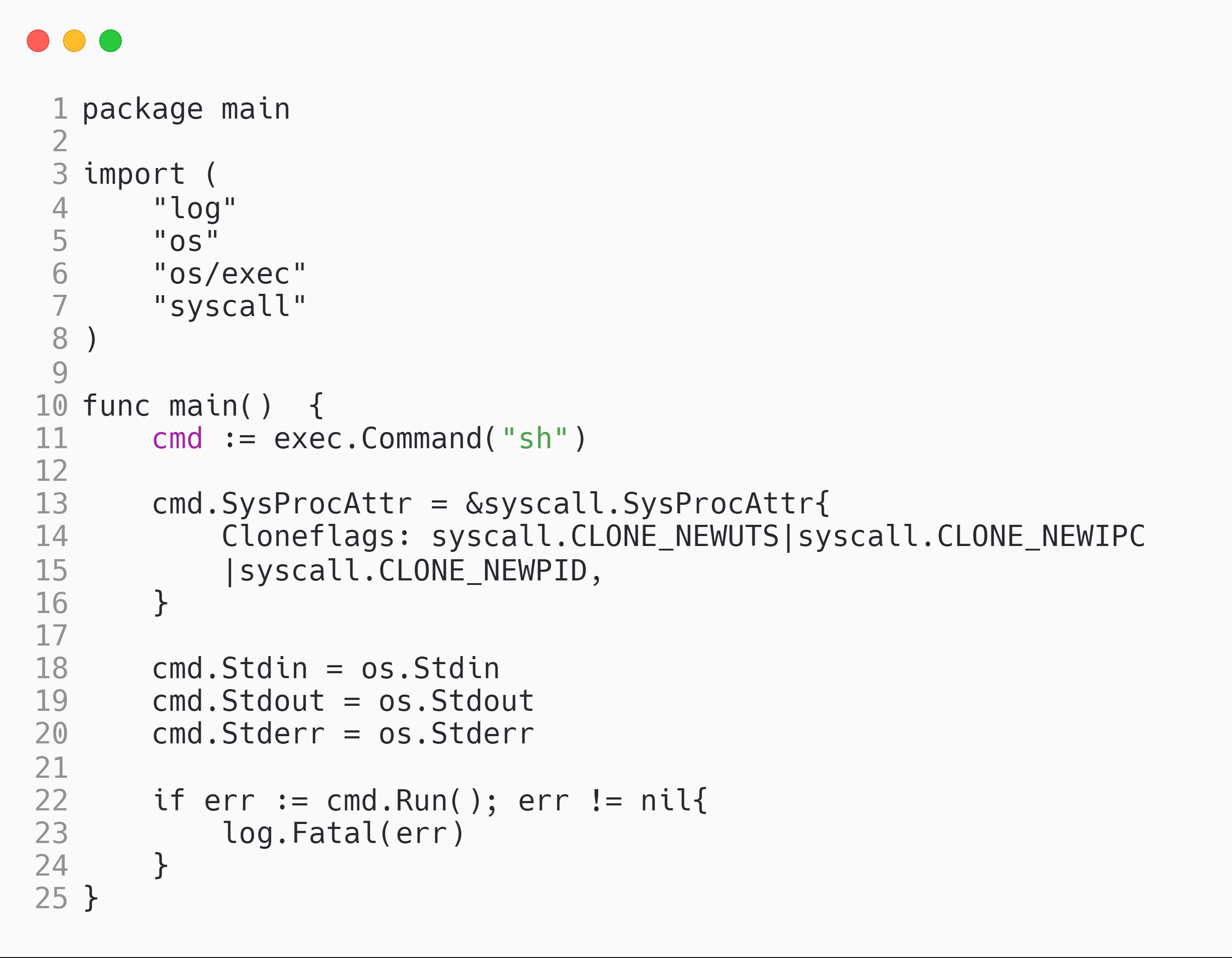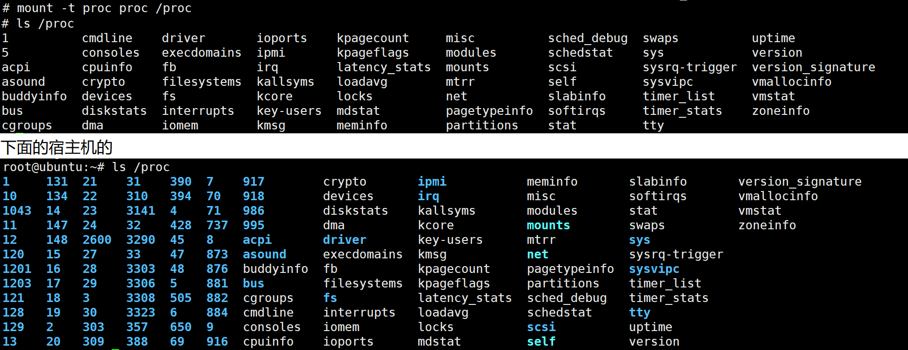 运行代码,然后查看一下/proc 的文件内容。proc 是一个文件系统,提供额外的机制,可以通过内核和内核模块将信息发送给进程。这里的/proc 还是宿主机的, 所以看到里面会比较乱,下面将/proc mount 到我们自己的Namespace 下面来。
