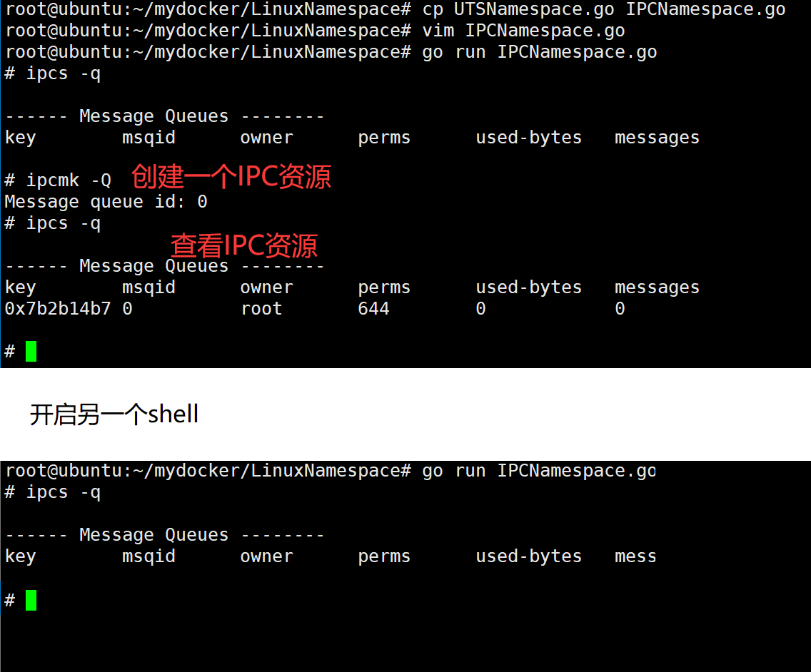 通过以上实验,可以发现在新创建的Namespace里,看不到宿主机上已经创建的message queue,说明IPC Namespace创建成功,IPC 已经被隔离。