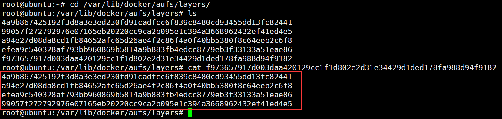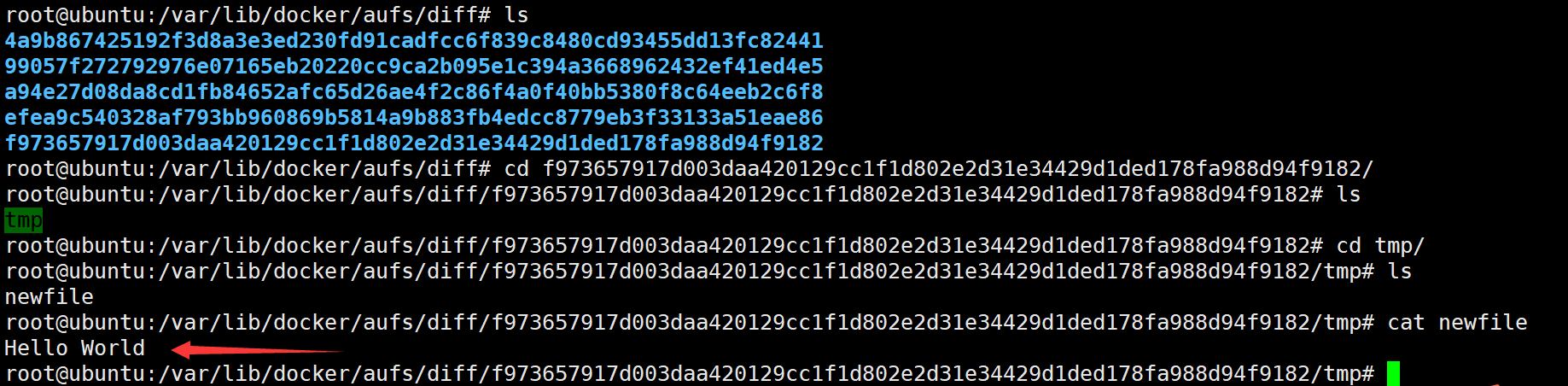 进一步探查/var/lib/docker/aufs/diff/f973657917d003daa420129cc1f1d802e2d31e34429d1ded178fa988d94f9182 文件夹,发现其中存储了一个/tmp/newfile文件,文件中只有一行"Hello world",至此我们完整地分析出了image layer和AUFS是如何通过共享文件和文件夹来实现镜像存储的。