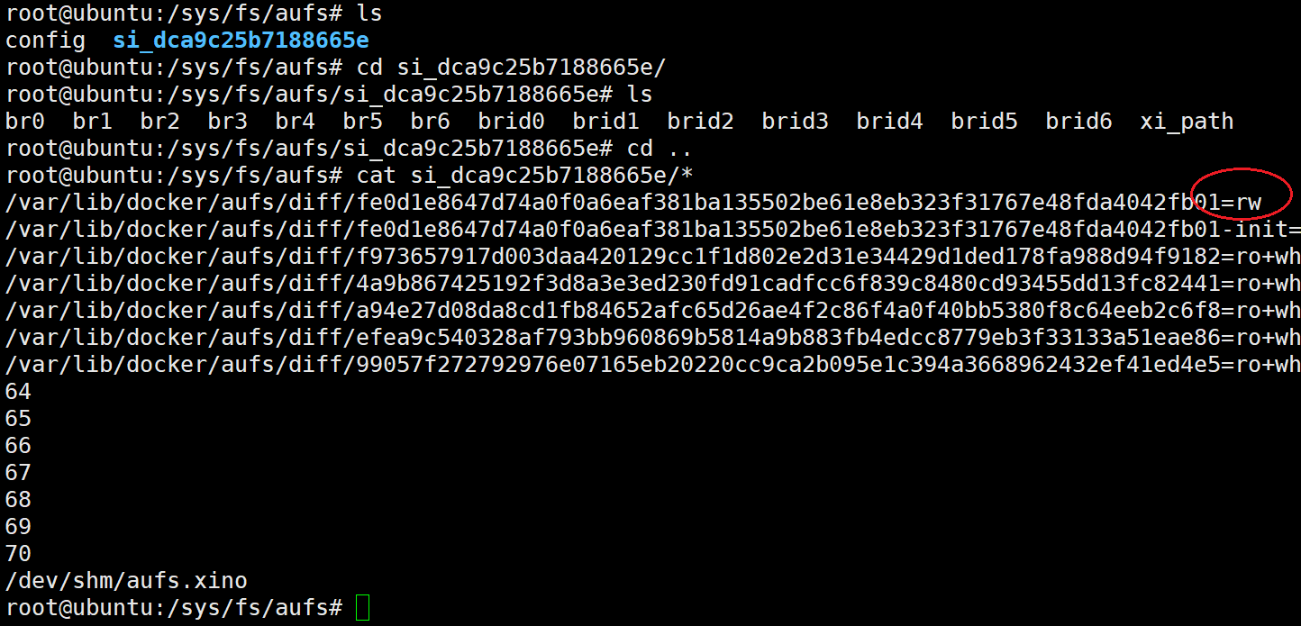 接下来从系统AUFS来看mount的情况,在/sys/fs/aufs/目录下多了一个si_dca9c25b7188665e文件夹,执行如下命令