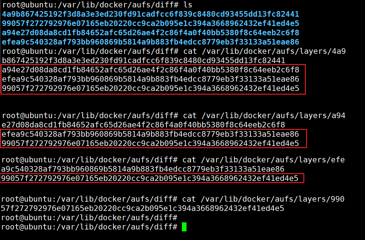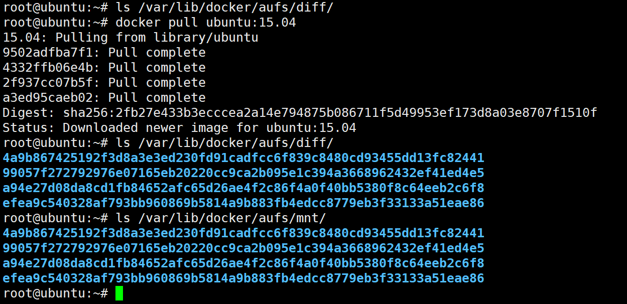拉取镜像后,可以看到在docker pull中的结果显示ubuntu:l5.04 镜像一共有4个layer ,在执行命令的结果中也有4个对应的存储文件目录。自从Docker1.10 之后,diff目录下的存储镜像layer文件夹不再与镜像ID相同。