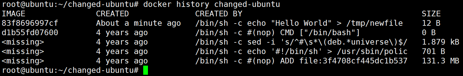 从输出中可以看到83f8696997cf image layer 位于最上层,只有12B 的大小,由/bin/sh -c echo "Hello World" > /tmp/newfile