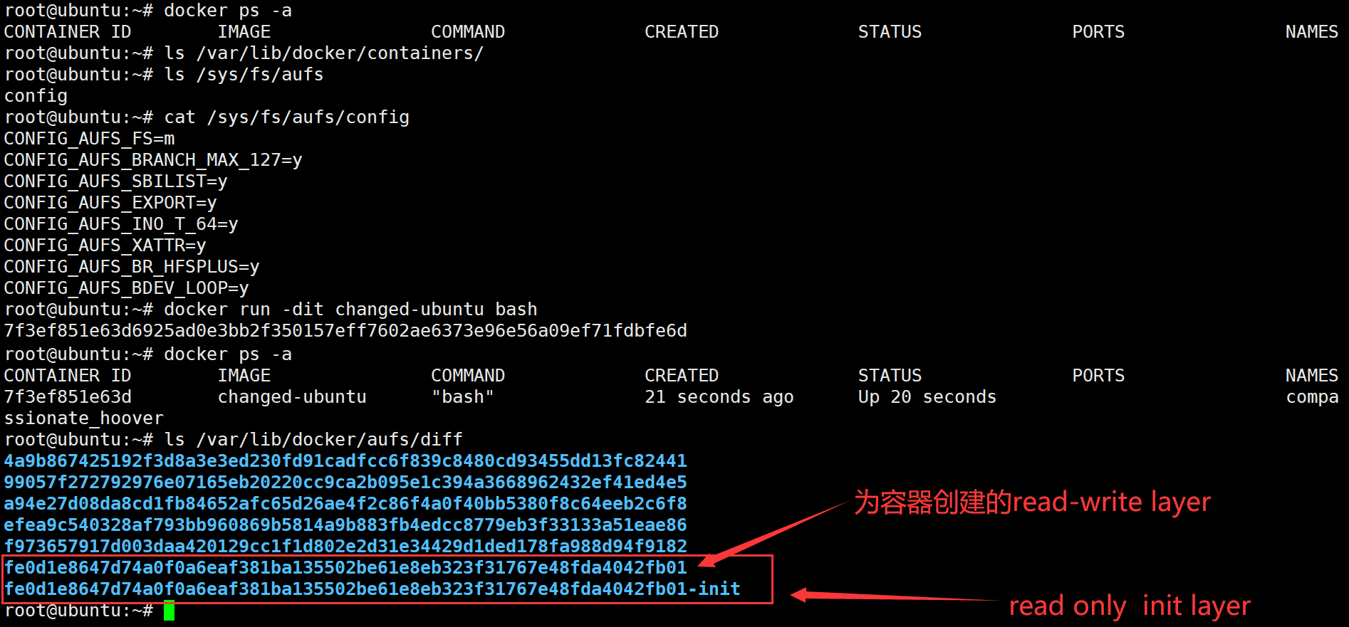 如上图,我们启动了一个changed-ubuntu容器,查看/var/lib/docker/aufs/diff目录发现,下面多了2个文件夹,fe0d1e8647d74a0f0a6eaf381ba135502be61e8eb323f31767e48fda4042fb01-init是Docker为容器创建的read-only的init layer,而fe0d1e8647d74a0f0a6eaf381ba135502be61e8eb323f31767e48fda4042fb01则是Docker为容器创建的read-write layer