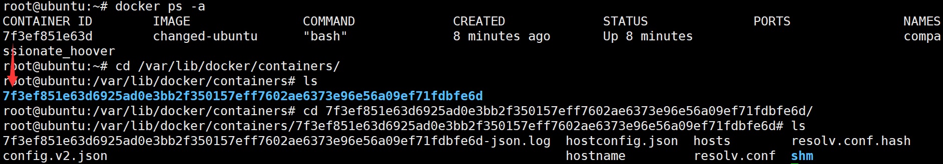 在/var/lib/docker/containers目录下多了一个与containerid 相同的文件夹,存放着容器的metadata和config文件